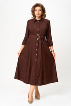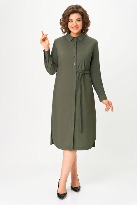Платье рубашка прямого силуэта с отложным воротником на стойке. По переду – нагрудные выточки, карманы в боковых швах. Застежка в виде планки на декоративных пуговицах-до талии и потайные пуговицы-ниже талии. Ассиметричная деталь-пояс на полукольцах. Фигурные разрезы в боковых швах. По спинке фигурная кокетка, центральный шов со встречной складкой в верху. Рукав в точной 1-шовный, длинный с застёжкой на планку спереди, со складкой по низу и манжетой
