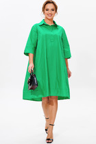 Платье женское свободного покроя из хлопковой ткани. Вырез горловины оформлен воротником рубашечного типа. Застежка- планка с потайными пуговицами. Рукава- реглан, переходящий в кокетки. На спинке- небольшая сборка в области лопаток. Имеются карманы в боковых швах. Спереди и сзади выполнены декоративные элементы в виде кулисы со шнурками. При их помощи можно регулировать объем талии и создавать приталенный силуэт. В боковых швах имеются разрезы.