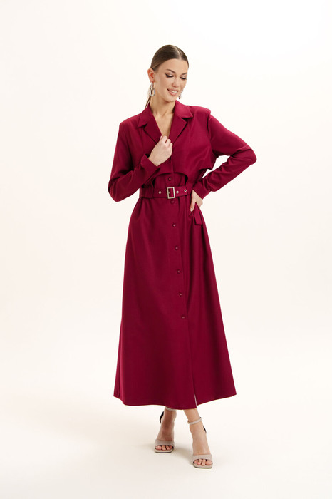 Платье женское А - силуэта из костюмной ткани. Вырез горловины оформлен воротником пиджачного типа с застежкой на петли с пуговицами. Рукава - втачные. В боковых швах выполнены карманы. Спереди и сзади изделие декорировано кокетками сложной архитектурной формы. При помощи пояса из основной ткани возможно создать приталенный силуэт.