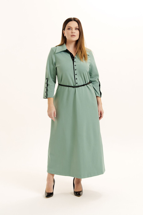 Платье женское прямого силуэта из мягкого и тонкого трикотажного полотна с небольшим расширением к низу. В боковых швах обработаны карманы. Рукав длиной 7/8 с обработанным разрезом, застежка на кнопки. Воротник рубашечного типа с застежкой по переду на планку с кнопками. Разрезы рукава и планка декорированы контрастной тканью. Спинка со средним швом.