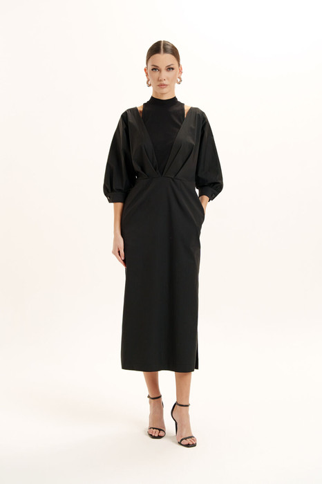 Красивое, стильное и элегантное платье прямого силуэта выполнено из хлопкового полотна и элит трикотажа. Модель платья классика с рукавом 3/4 ЛЕТУЧАЯ МЫШЬ, низ рукава на манжете. Горловина оформлена воротником - стойка из отделочной ткани с застежкой по спинке на потайную молнию , что делает платье универсальным нарядом в гардеробе любой женщины или девушки. На платье обработан подрез со складками. По боковому шву разрез.