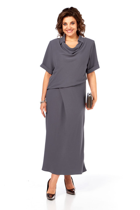 Платье женское длиной до середины икры, слегка расклешенное к низу. Спинка с косым передом в области талии и средним швом до разреза. Перед с косым подрезом в области талии, образующий мягкую складку  из лифа и 1 глубокую складку от подреза вниз. Горловина с рубашечным воротником на стойке и драпировкой в виде качели. Рукав втачной с отложными манжетами.