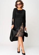 Платье женское длиной до середины икры, слегка расклешенное к низу. Спинка с косым передом в области талии и средним швом до разреза. Перед с косым подрезом в области талии, образующий мягкую складку из лифа и 1 глубокую складку от подреза вниз. Горловина с рубашечным воротником на стойке и драпировкой в виде качели. Рукав втачной с отложными манжетами.