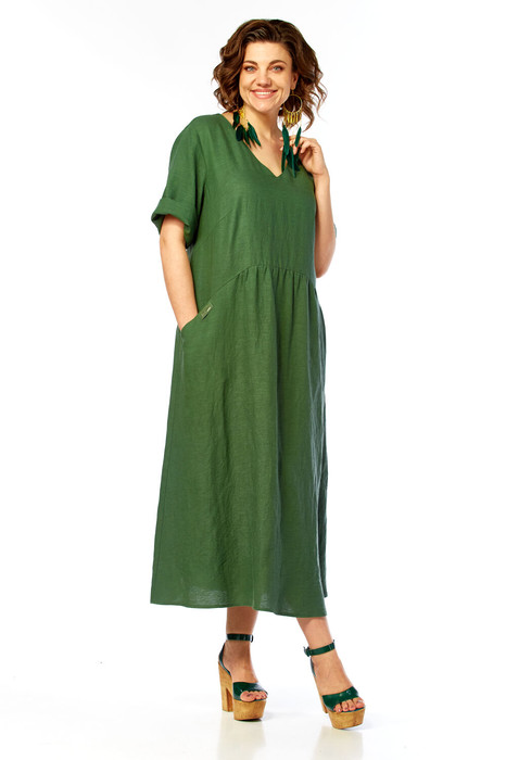 Платье женское свободного кроя . Спинка со средним швом и полукруглым подрезом в области талии. Перед с V-образной горловиной и полукруглым подрезом в области талии. В нижней части переда и спинки сборка в центральной части . Боковые карманы обработаны в шве подреза переда. Правый карман украшен нашивкой. Рукав втачной одношовный длиной до локтя. Фурнитура может отличаться от заявленной на фото.