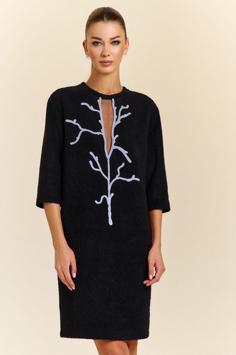 Платье женское свободного силуэта. По переду платья выполнена вышивка из шнура и сетки. Рукав в изделии 3/4.