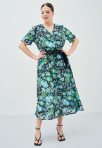 Платье-трапеция с вытачками на груди и широким воланом внизу, который выкроен по кругу. Воротник отложной, со стойкой. Спереди шнуровка с металлическими люверсами. Рукав короткий, втачной с манжетом, подогнутым вверх. Модель выполнена из костюмной, вискозной ткани высокого качества, с плетением "под лен".