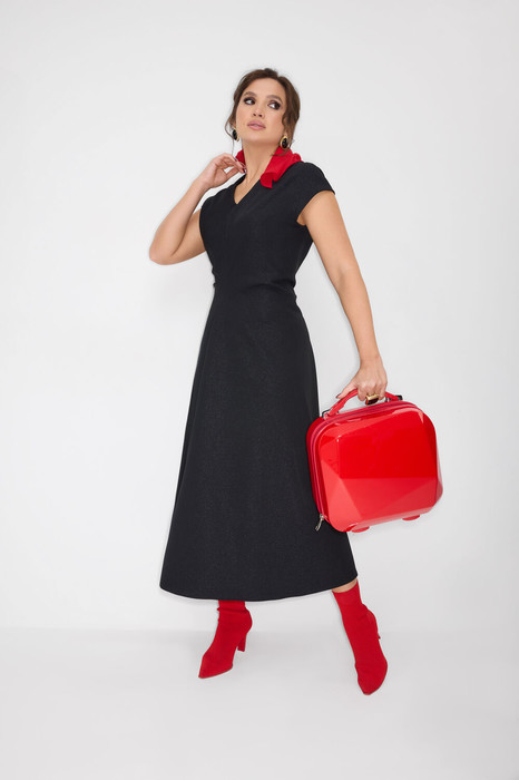 Платье женское, прилегающего силуэта. По переду и спинке средние швы. Вырез горловины по переду V-образный. Линия плеча спущенная. Платье выполнено "по косой", что позволяет достичь хорошей посадки изделия на фигуре, без дополнительных швов и вытачек. В комплете украшение.
