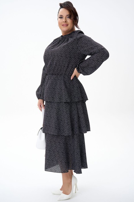 Лаконичное миди-платье из воздушного шифона — идеальный выбор для деловых и повседневных образов. Элегантный мелкий горох на тёмном фоне, высокая собранная горловина и многоярусная юбка создают женственный силуэт, который мягко скрывает проблемные зоны и подчёркивает талию. Носится с лодочками и строгой сумкой днём, с аксессуарами — вечером.