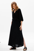 Платье выполнено из прозрачного трикотажного полотна с металлизированной нитью. Платье прямого силуэта, длиной выше линии колена. Перед и спинка цельные. Воротник-стойка, застегивающийся спереди на петлю и пуговицу Плечевой шов заужен. Рукав втачной, одношовный, длиной до линии локтя, со сборкой по окату. Платье на трикотажной подкладке.