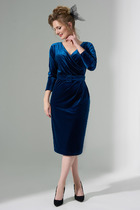 Платье выполнено из плательно-блузочной ткани с цветочным принтом. Платье Х-образного силуэта, длиной миди, отрезное по линии талии. Горловина V-образной формы. В среднем шве спинки застежка на потайную молнию. Плечевой шов укороченный. Рукав втачной, одношовный, длиной чуть ниже линии локтя . Рукав расширен к низу и обработан эластичной тесьмой. Юбка расширена к низу. В комплект входит съемный ремень из отделочной ткани.