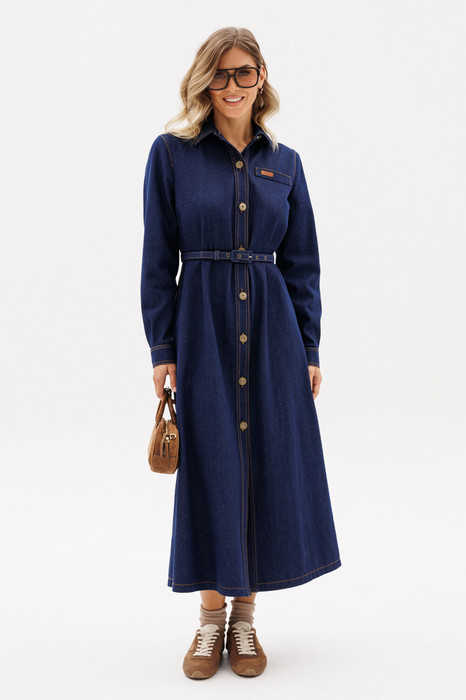 Платье выполнено из плотного джинса. Платье А-образного силуэта, длиной миди. Застежка спереди на металлические пробивные пуговицы. На спинке кокетка и встречная складка от нее. Воротник стояче-отложной с отрезной стойкой. Рукав втачной, одношовный, с прорезью и складками по низу. Низ рукава на манжете, застегивающейся на пуговицу. В боковых швах карманы. Платье декорировано нашивками из натуральной кожи по переду и спинке. В комплект входит ремень из сновной ткани с обтяжной пряжкой.