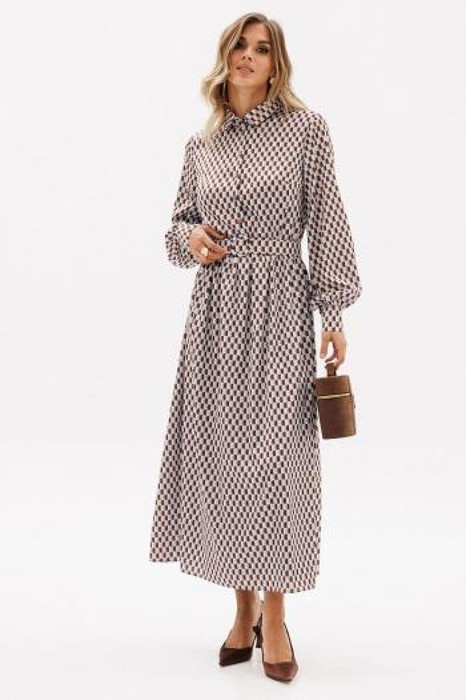 Платье выполнено из тонкого атласа с принтом. Платье отрезное по линии талии. Воротник рубашечного типа. Застежка спереди на пуговицы на планке. Рукав втачной, на манжете. Лиф и юбка платья на подкладке из тонкого однотонного атласа.  В комплект входит съемный ремень из основной ткани с обтяжной пряжкой.