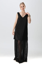 Платье полуприлегающего силуэта выполнено из льна-вишера. Воротник - отложная стойка. Рукав втачной - спущенный 3/4 с декоративными патами. Изделие отрезное по линии талии. Юбка изделия А-силуэта. В боковых швах функциональные карманы с клапаном. Застежка-молния