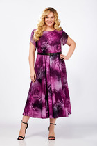 Платье женское повседневное полуприлегающего силуэта с фигурным низом расширенное к низу, выполнено из плательной ткани. Вырез горловины воротник «стойка», рукав втачной 7/8 по низу на притачной манжете собран на сборку. В рукаве отделочная пата которой можно регулировать длину рукава и делать короче. В боковых швах обработаны карманы и разрезы . По переду застежка до талии на обметанные петли и три отделочных пуговицы, по спинке фигурная кокетка и встречная складка. Платье расширено к низу за счет складок по переду. Декором служит отделочная нашивка по спинке и декоративные пуговицы по переду и рукавам.