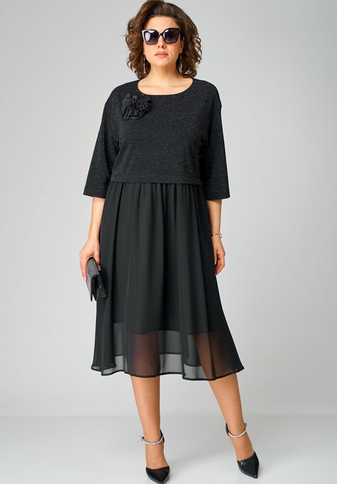 Платье женское нарядное полуприлегающего силуэта до талии, расширенное к низу отгрезное по талии. Выполнено из трикотажного полотна в сочетании с шифоном. Вырез горловины круглый обработан обтачкой, по спинке застежка на навесную петлю и пуговицу. Рукав втачной 3/4. Юбка из шифона на подкладке, по талии собрана на сборку. Декором служит съемный цветок.