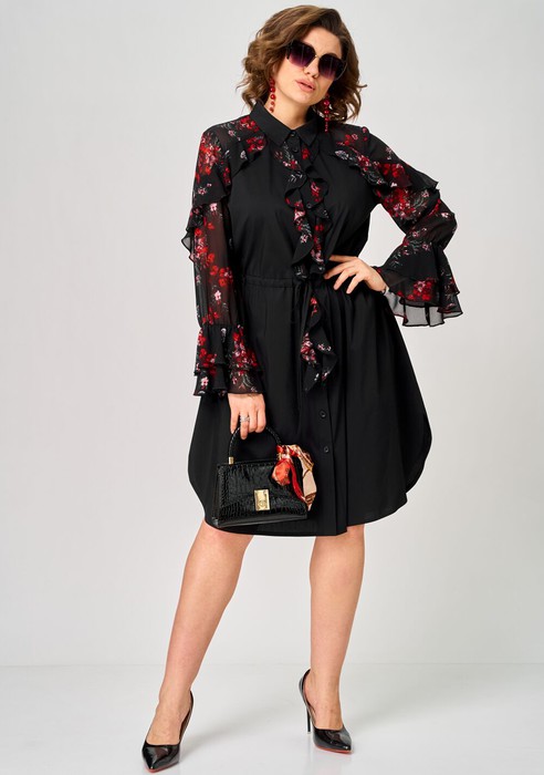 Платье женское шикарное стильное нарядно повседневное прямого силуэта. Выполнено из хорошего хлопка в сочетании с красивым легким воздушным принтованным шифоном. Вырез горловины вортник на стойке рубашечного типа, застежка доверху на обметанные петли и пуговицы, что дает возможность регулировать глубину декальте. Рукав втачной по низу на притачной манжете из двух воланов. По талии втянута кулиса с помощью которой регулируется желаемый размер талии и скрадываются все недостатки. Низ платья в стильном современном дизайне - фигурный. В боковых швах обработаны небольшие разрезы. Декором платья служат очень красивые воланы из шифона.