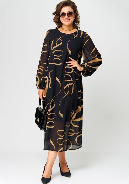 Платье женское нарядно-повседневное А-образного силуэта, выполненео из креп-шифона. Платье на трикотажной подкладке. Вырез горловины круглый на обтаке, по спинке астежка на навесную петлю и пуговицу. Рукав втачной по низу собран на резинку. В бокох швах обработаны разрезы, низ платья фигурый.Декором платья служит принт самой ткани. Пояс в комплекте.