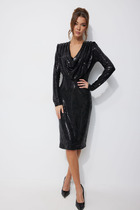 Платье женское нарядно-повседневное полуприлегающего силэта до талии расширенное к низу. Платье отрезное по талии на трикотажной подкладке, выполнено из креп-шифона. Вырез горловины V-образный обработан обтачкой, по горловине полочки и спинки двойные воланы. Рукав втачной по низу на резинке. По юбке небольшие складки. В боковых швах обработаны разрезы, низ фигурный. Декором платья служит съемный пояс из основной ткани и рюши по горловине платья.