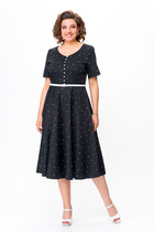 Свободный А-силуэт с заниженной линией плеча, V-образный глубокий вырез со вставкой. Полочка со средним швом и складками-защипами ниже уровня талии. По складкам - фиксирующие декоративные строчки. Спинка со средним швом. В боковые швы вставлен пояс, который подчёркивает линию талии, завершая образ.