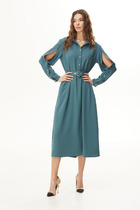 Верхнее платье А-силуэта, отрезное по линии талии на полочке, с мягкой складкой и эффектными разрезами по центру переда и боковым швам. Рукав втачной, на притачной манжете со сборкой в нижней части.
