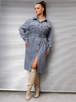 Джинсовое платье-рубашка свободного силуэта с функциональными накладными карманами по переду и в боковых швах, рукава со спущенной линией плеча с манжетами, воротник рубашечный, застежка-планка на петли и пуговицы. В комплекте съемный пояс из основной ткани. Изделие можно носить как платье, так и как легкий тренч, плащ. Материал при правильном уходе не теряет своих свойств.