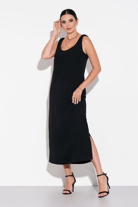 Женское платье миди свободного силуэта на широких бретелях с резинками и разрезом по боковому шву выполнено из мягкой непросвечивающейся ткани.