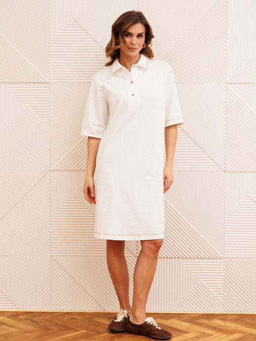 Платье прямого силуэта с воротником поло. Рукав втачной одношовный. По низу изделия, по низу рукава и по воротнику проложена отделочная строчка. Длина платья - 97 см, длина рукава - 30 см