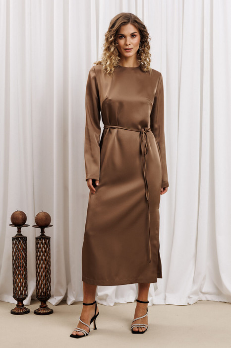 Платье прямого силуэта выполнено из атласной ткани. Перед с нагрудной вытачкой. Спинка с застежкой "капелькой" на петлю и пуговицу сверху. В боковом шве разрез. Рукав втачной одношовный.  К платью прилагается пояс из основной ткани. Длина платья 125 см, длина рукава - 61 см.