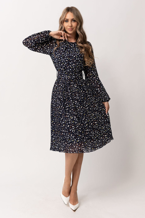 Платье без воротника, с круглым вырезом горловины, застежкой на потайную молнию в среднем шве спинки. Платье отрезное по линии талии. Верхняя часть переда со сборкой у горловины. Верхняя часть спинки со средним швом. Нижняя часть платья с плиссе, с параллельными складками. Рукав втачной, длинный с отрезной манжетой. Окат и низ рукава со сборкой. Манжета рукава с застежкой на одну петлю и пуговицу. Платье со съемным поясом.