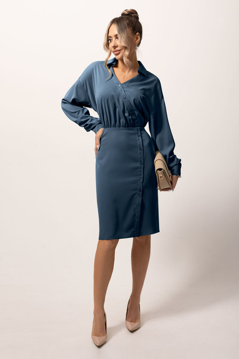 Платье, с асимметричной застежкой на петли и пуговицы по планкам переда, и на потайную молнию в левом боковом шве, с втачным воротником и отрезной стойкой. Платье отрезное по линии талии Лиф переда и верхняя часть спинки по талиевому шву присборены. Плечо спущенное. Рукав втачной, длинный, с отрезной манжетой, застегивающейся на две петли и пуговицы.