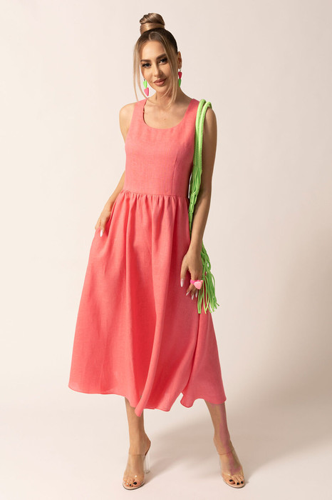 Платье с застежкой на потайную молнию в среднем шве спинки, без воротника, без рукавов, с круглым вырезом горловины. Платье отрезное по линии талии. Шов по талии присборен. Лиф переда с нагрудными и талиевыми вытачками. Спинка со средним швом, талиевыми вытачками. В боковых швах расположены карманы.