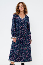 Платье с застежкой на потайную молнию в среднем шве спинки, без воротника, с круглым вырезом горловины. Платье отрезное по линии талии. Лиф переда и спинки с рельфами, выходящими из плеча. По правому рельефу переда и спинки- волан. Нижняя часть платья с двумя рельефами. Нижняя часть спинки со средним швом, двумя рельефами. Платье без рукавов.