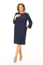 Платье полуприлегающего силуэта, расширенное к низу, c втачным воротником- стойкой, застегивающейся по левому плечу на петли и пуговицы. По переду со средним швом и нагрудными вытачками. По горловине переда- V-образный вырез. Спинка со средним швом. По боковым швам расположены разрезы. Рукав втачной, длинный, со сборкой по окату. По низу рукава- отрезная манжета, по шву притачивания манжеты- сборка. Платье со съемным поясом.
