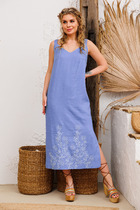 Платье с центральной застежкой на петли и пуговицы, с втачным воротником с отрезной стойкой. Платье отрезное по линии талии. По лифу переда, нагрудные и талиевые вытачки. Лиф спинки с талиевыми вытачками. Рукав втачной, короткий. В боковых швах расположены карманы. Платье со съемным поясом.