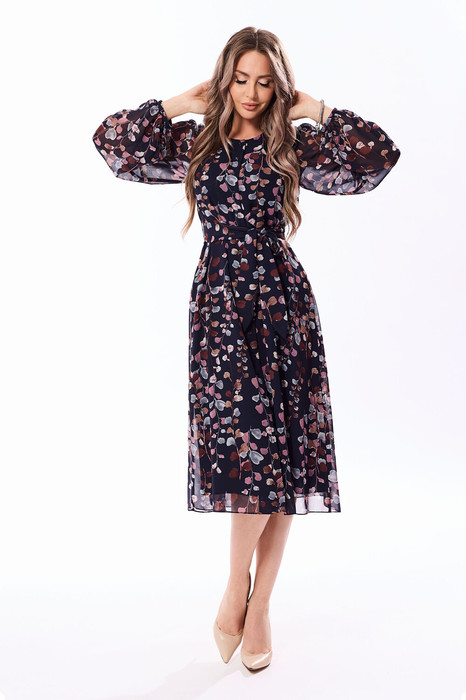 Платье с центральной застежкой на петли и пуговицы, без воротника, с круглым вырезом горловины. Полочки с нагрудными вытачками Боковые швы со шлевками. Платье со съемным поясом. Рукав втачной, 3/4, с отрезной манжетой. Окат и низ рукава со сборкой.