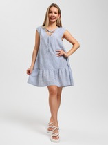 Платье с центральной застежкой на петли и пуговицы, втачным воротником с отрезной стойкой. По переду с клапанами, расположенными на уровне груди. Спинка с отрезной кокеткой. По шву притачивания кокетки- встречная складка. По боковым швам- разрезы. Рукав втачной, длинный, с отрезной манжетой. По левому рукаву отделка- декор в виде розы. Платье двойное. Нижнее платье на бретелях, с нагрудными вытачками по переду.