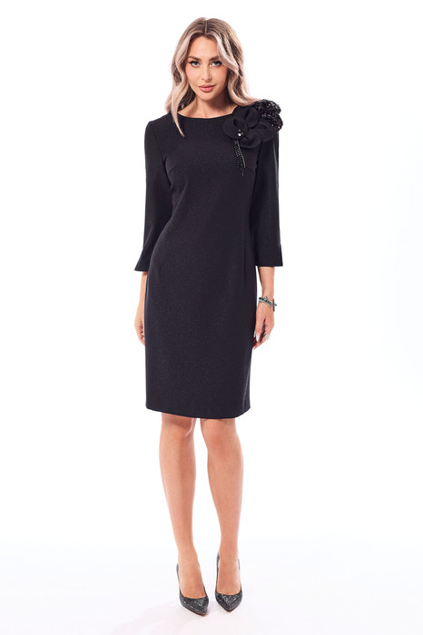 Платье без воротника, с фигурным вырезом горловины, застежкой на потайную молнию в среднем шве спинки. По переду с талиевыми и нагрудными вытачками. Спинка со средним швом, заканчивающимся шлицей, талиевыми вытачками. Рукав втачной, 3/4, со швом по верхнему срезу, заканчивающимся разрезом. Платье со съемной брошью.