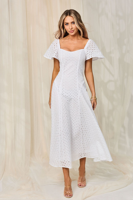 Платье с центральной застежкой на потайную молнию в среднем шве спинки, без воротника, с фигурным вырезом горловины. По переду с рельефами, выходящими из горловины до низа. Рельефы переда с фигурным подрезом по линии талии. Спинка со средним швом, рельефами, выходящими из горловины до низа. Рукав втачной, короткий, крылышко. Горловина спинки и окат рукава присборен на резинку.