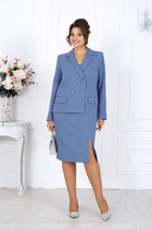Платье с центральной застежкой на петли и пуговицы, втачным воротником с отрезной стойкой. По переду с клапанами. Спинка с отрезной кокеткой, переходящей на перед. Платье двойное. Нижнее платье на бретелях, с нагрудными вытачками по переду. Платье со съемным поясом.