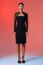Платье с круглым вырезом горловины, без воротника, застежкой на петли и пуговицы по спинке. Платье отрезное по линии талии, с втачным поясом. Верхняя часть переда с рельефами, выходящими из проймы. Верхняя часть спинки с талиевыми вытачками, фигурным вырезом горловины и фигурным вырезом по низу, застежкой на две петли и пуговицы. Нижняя часть платья со сборкой по шву притачивания к поясу. Рукав втачной, короткий. В боковых швах расположены карманы.