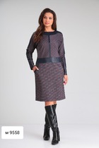 Платье без воротника, с фигурным вырезом вырезом горловины, застежкой на потайную молнию в среднем шве спинки. Платье отрезное по линии талии. Лиф с рельефами, выходящими из горловины. Рельефные швы лифа усилены регилином. Лиф спинки с рельефами, выходящими из горловины. Спинка со средним швом. Рукав втачной, длинный, с отрезной манжетой. По окату рукава-притачная планка, присборенная на резинку. Низ рукава присборен по шву притачивания манжет.