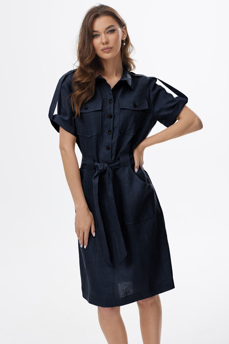 Платье с центральной застежкой на петли и пуговицы, втачным воротником с отрезной стойкой. По переду- накладные карманы с клапанами расположенные на уровне груди. Накладные карманы с цельнокроенной патой расположены на уровне бедер. Спинка со средним швом. Пата рукава переходящая в погон по плечевым швам. Платье со съемным поясом.