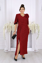 Свободное платье-свитер прямого покроя с разрезом по детали переда с левой стороны. Линия плеча спущенная с втачным рукавом прямого покроя стандартной длины. Вырез горловины округлый со свитерным воротником.