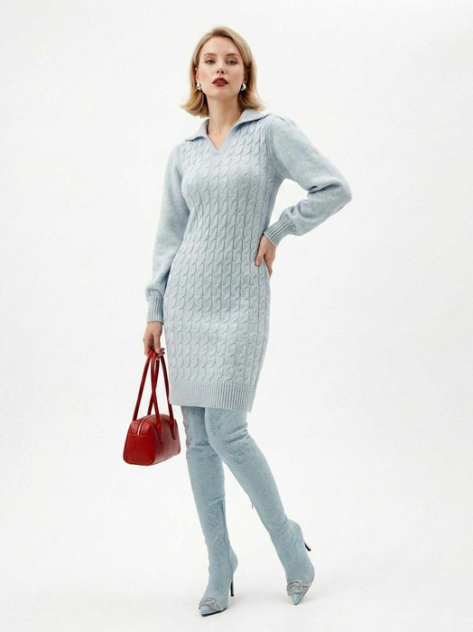 Вязаное платье прямого покроя полуприлегающего силуэта длиной до середины бедра (про росте 170 и Ог и Об соответствующих по ГОСТ 17522-72). Рукав втачной прямого покроя стандартной длины. Линия плеча немного спущенная. Вырез горловины круглый с имитацией "поло" без застёжки и широким отложным воротником.