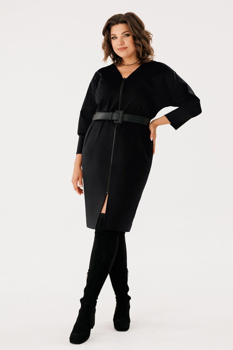 Платье полуприлегающего силуэта, вырез горловины V – образный, рукав цельнокроеный спущенный со вставками из кожи и на манжете внизу. По спинке кокетка, в боковых швах функциональные карманы. Застежка на тесьму-молнию. В комплекте ремень из экокожи.