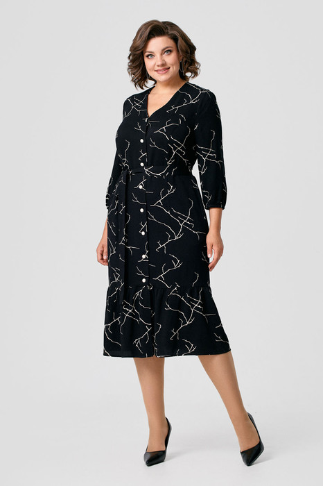 Классическое женское платье полуприлегающего силуэта из мягкой приятной к телу непросвечивающейся натуральной вискозы. Платье с V-образным вырезом горловины и втачными рукавами на резинке по низу застегивается на петли и пуговицы. По низу изделия отрезной валан с небольшой сборкой. В комплект входит съемный пояс.