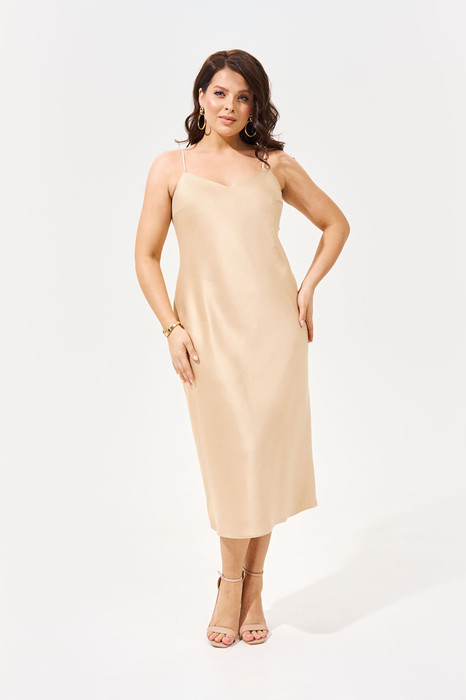 Женское шелковое платье-комбинация на регулируемых бретелях длины миди. Платье выполнено "по косой" из плотного, держащего форму шелк-сатина без подкладки. В бокой шов вшита потайная молния.
