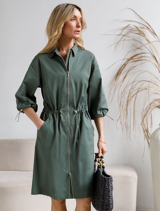 Состав: 97%Хлопок 3%ПУ Параметры модели на первом фото: Рост 172, бюст 88, талия 64, бедра 88Платье в стиле сафари выполнено из хлопкового твила. Посадка и объем рукава регулируются с помощью металлических стоперов. Модель дополнена боковыми карманами и золотистой застежкой на молнию. Благодаря наличию эластана в составе изделие сохранит свой безупречный внешний вид в течение долгого времени. Обладает высокой воздухопроницаемостью, в платье будет комфортно даже в жаркое время года.