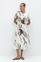 Платье из хлопка- сатина расклешенное от линии талии, без рукава, с круглым вырезом горловины.
