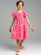 Платье для девочки из сетки, средней длины, прямого силуэта, с широкими втачными рукавами длиной до локтя, отрезное по линии талии, круглым вырезом горловины. Юбка присборена по талии. Платье со съемной подкладкой контрастного цвета из кулирного трикотаж